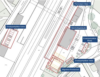 Das Parkplatzangebot auf dem Bahnhofvorplatz wird eingeschränkt sein. Provisorische Ersatzparkplätze für Autos stehen im Westen des Bahnhofs zur Verfügung, Ersatzparkplätze für Velos und Mofas sind auf dem Bahnhofvorplatz vorhanden.